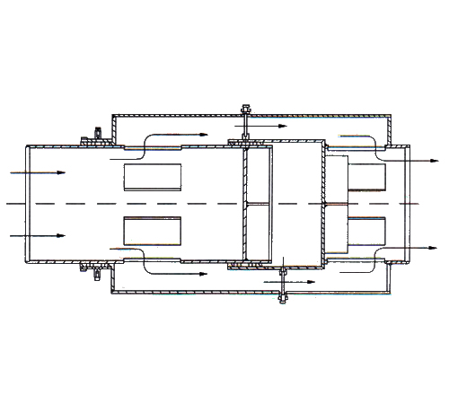結(jié)構(gòu)特點(diǎn)是:外套管串聯(lián)兩個(gè)填料密封箱,內(nèi)套管后端加擋板,流體經(jīng)內(nèi)套管的孔道引到兩密封箱間隔腔,再經(jīng)外套管間隔腔處孔道,引回到后部加擋板的主管道。這種補(bǔ)償器比平衡腔式補(bǔ)償器減少一個(gè)密封箱,結(jié)構(gòu)簡單,但比平衡腔型補(bǔ)償器重量大,安裝尺寸長。